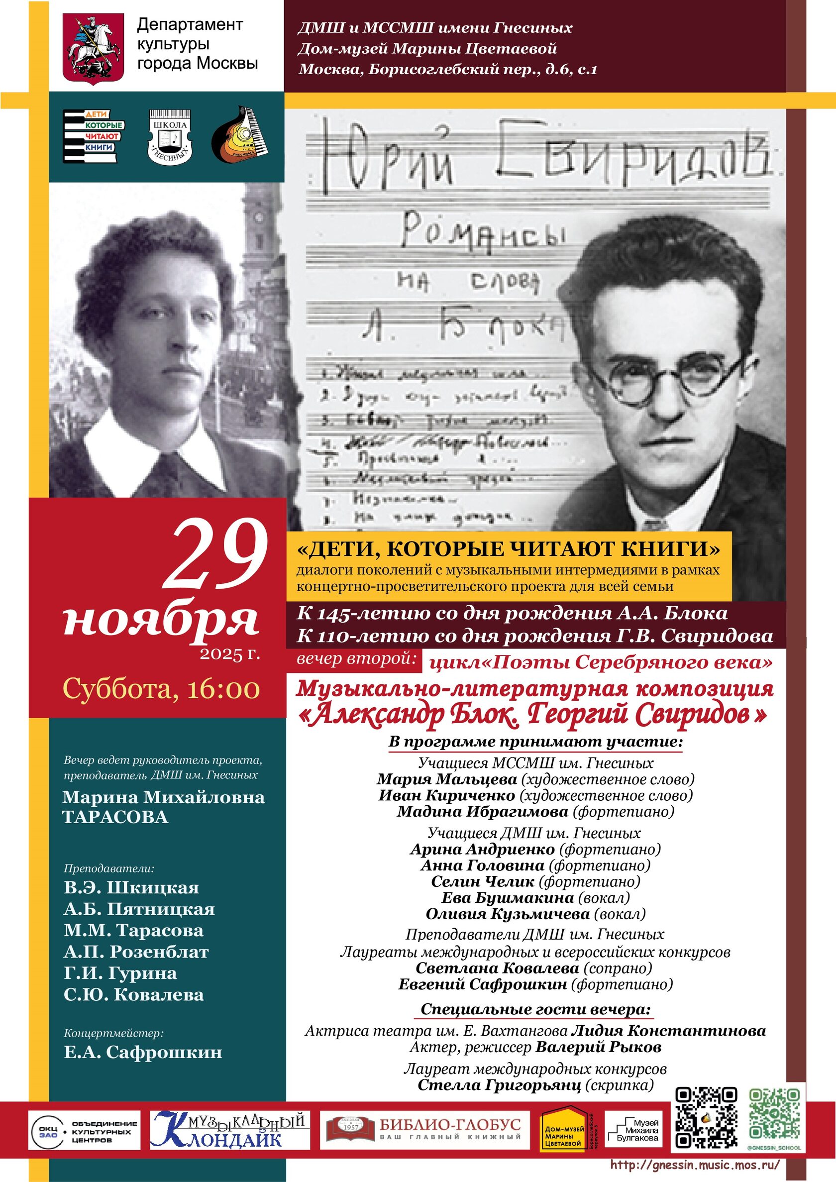 29 ноября, в субботу, в 16:00 Дом-музей Марины Цветаевой вновь станет местом встречи музыки и слова. В этот раз программа концертно-просветительского проекта "Дети, которые читают книги" будет посвящёна двум юбилеям — 145-летию Александра Блока и 110-летию Георгия Свиридова.