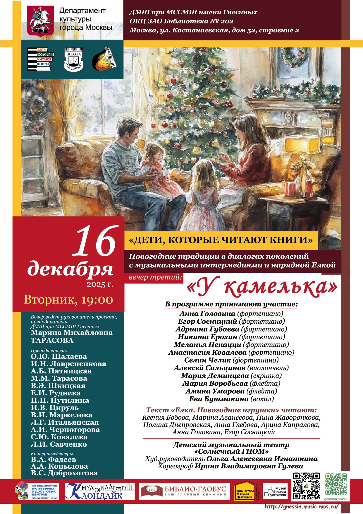 16 декабря, в 19:00, приглашаем на новую встречу проекта для всей семьи «Дети, которые читают книги». В этот вечер участники концерта, учащиеся ДМШ при МССМШ им. Гнесиных, обратятся к самому уютному и волшебному времени зимы – Новому году.