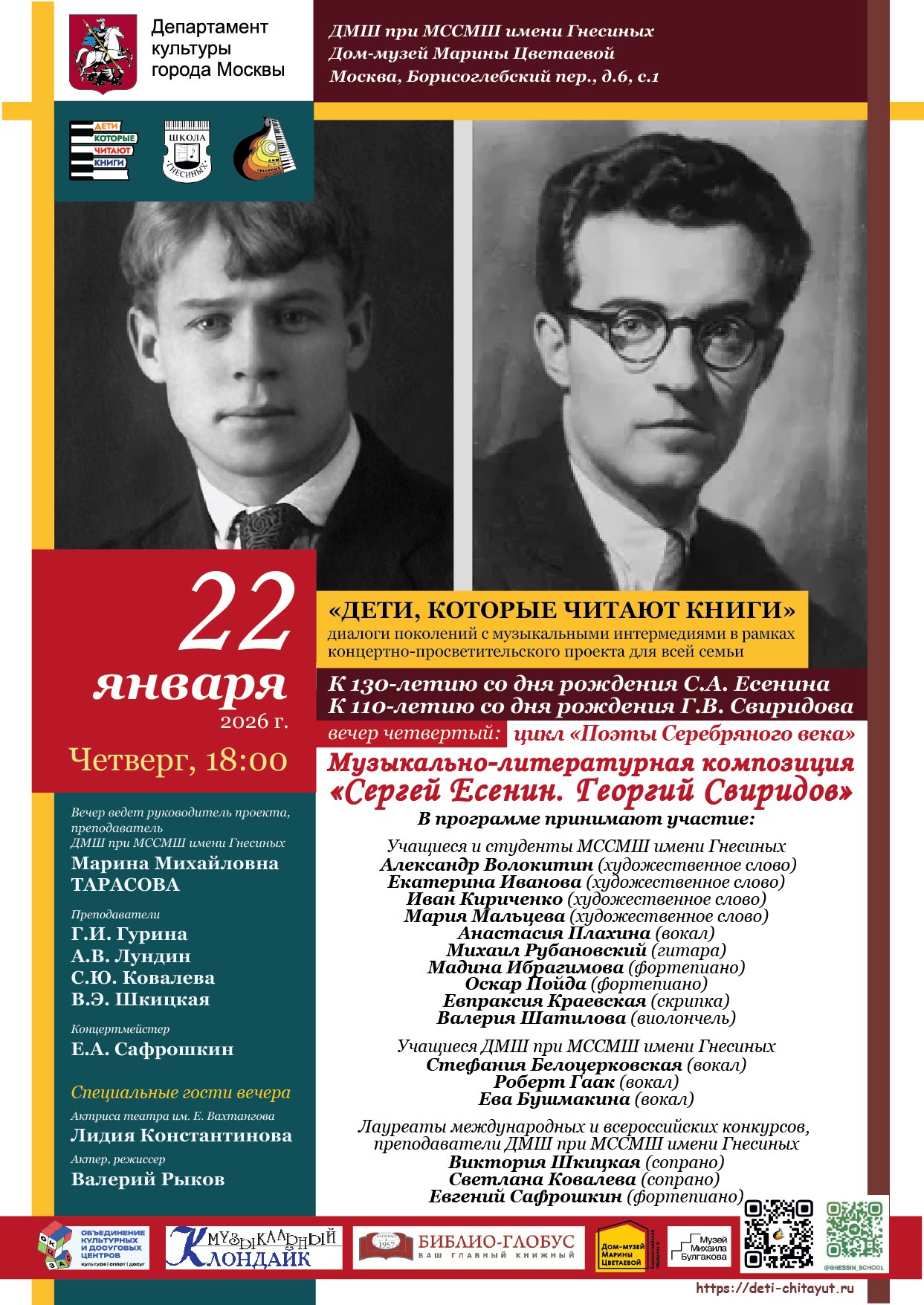 По сложившейся традиции, музыкально-литературную композицию предварит презентация о жизни и творчестве Сергея Есенина и Георгия Свиридова, которую проведёт автор идеи и руководитель проекта Марина Тарасова.
