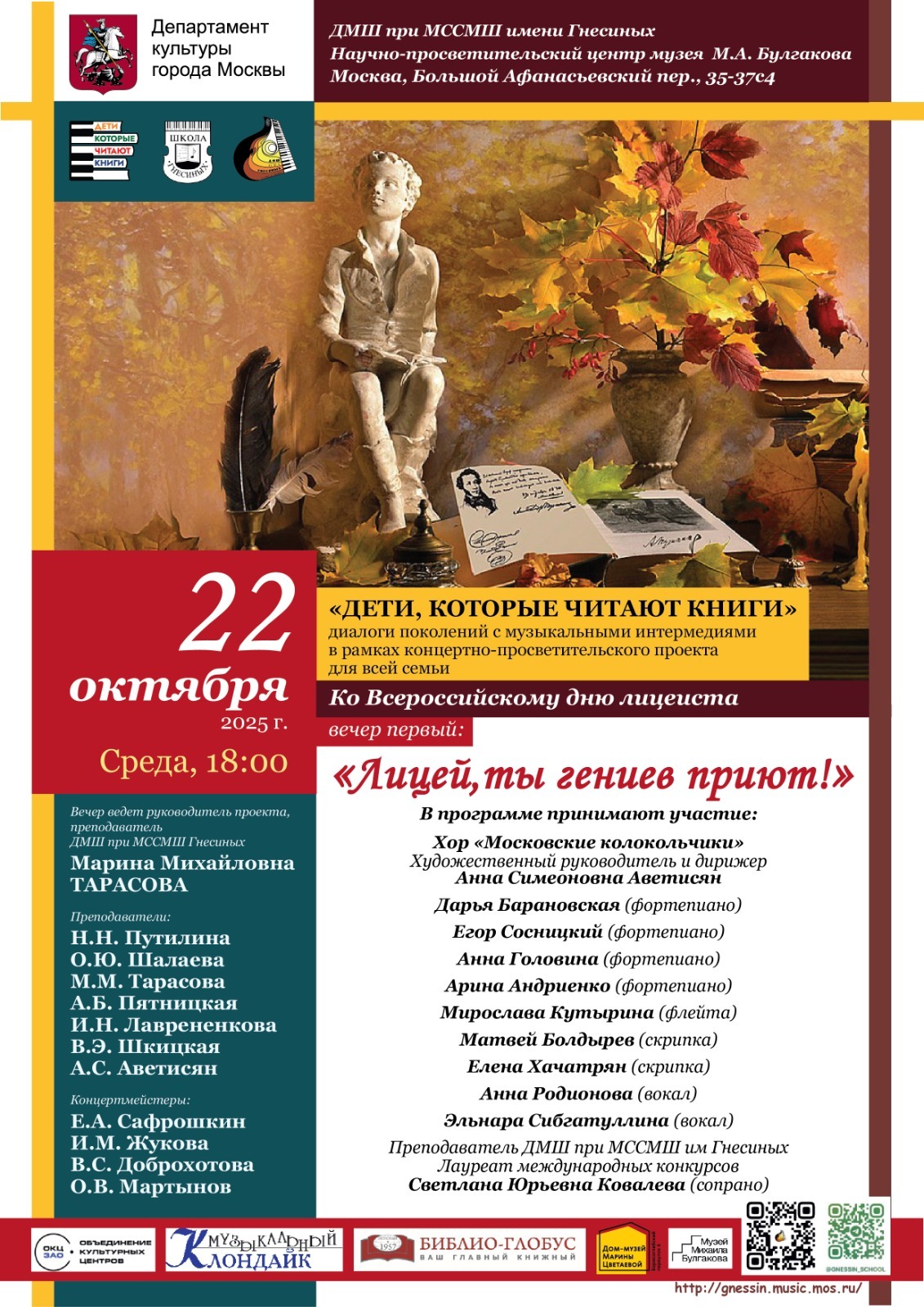 22 октября в Научно-просветительском центре музея М.А. Булгакова состоится праздничное мероприятие «Лицей, ты гениев приют» — ко Всероссийскому дню лицеиста. Так откроется третий сезон концертно-просветительского проекта «Дети, которые читают книги».